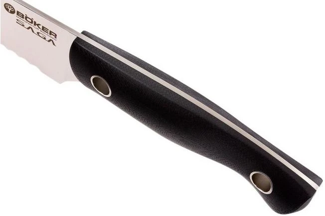 This Böker Saga bread knife is ideal for cutting bread. However, the serrated blade is also suitable for cutting hard fruits and vegetables such as melons, pumpkins and celeriac. Basically, any foods with a hard exterior. We prefer to call it a serrated knife rather than a bread knife. The two characteristic holes in the handle give this serrated knife a striking appearance.