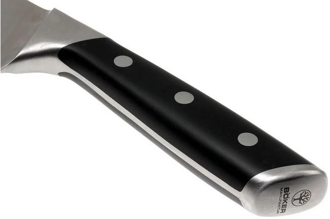 The Böker Forge Santoku kitchen knife combines innovative design with premium materials. Just like with their outdoor knives, Böker offers true quality and great ergonomics with their kitchen knives. A perfect balance thanks to the full-tang grip combined with razor-sharp German X50CrMoV15-steel blades. Also, the blade has no crop which basically gives you more blade to cut with and makes it easier to sharpen. The beautiful ABS-handle fits perfectly on the handle. Dirt has no chance to nest here. The Böker Forge Santoku gives you real German quality.