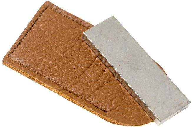 The Case Knife Sharpener diamond-coated sharpening stone is a small sharpening stone you can easily take with you. Perfect when sharpening your Case knife on the road. You don’t water or oil as you sharpen your knife. As such you can use this stone no matter where you find yourself. You can use both sides of this stone. One side is enhanced with a groove over the entire length. Great if, in addition to your knives, you also wish to sharpen pointy objects like a fishhook or dart. If you want to sharpen a flat knife you need to use the completely flat side of the sharpening stone. The pocket-sized sharpening stone comes with leather cover.