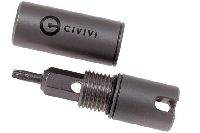 The grey Civivi Key Bit Container is a compact and very handy tool if you like to tinker with your pocket knives. This container is a handy waterproof storage place and bit holder in one. Unscrew the cap and you’ll find a steel T6 and T8 Torx bit that you click into the magnetic cap. The steel ring allows you to hang the container on your key ring. This means you always have access to the tools to maintain your (Cvivi) pocket knife.