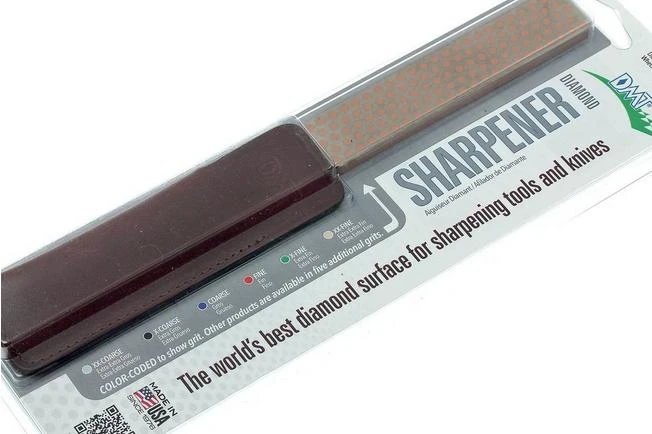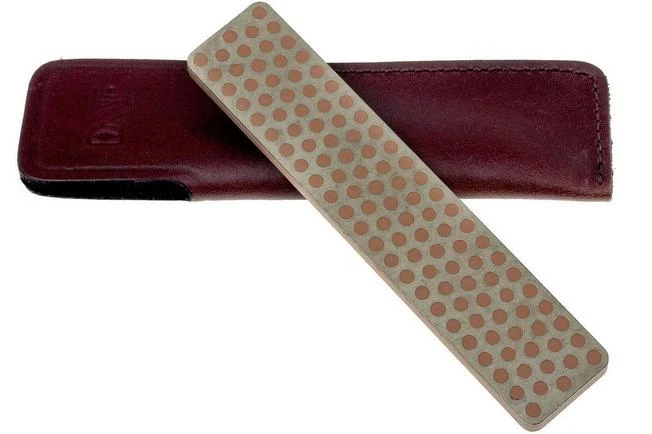 Sharpening stone with diamond sharpening surface with the wellknown circular pattern. The stone has an extra, extra fine grit. This sharpening stone comes with a true leather sheath. Because of the compact size, this sharpening stone is ideal for use on the road.