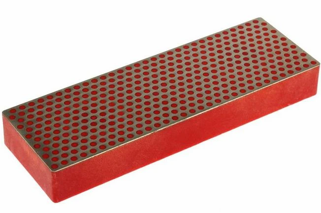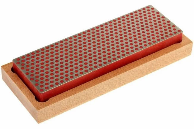 Sharpening stone with diamond sharpening surface with the well-known circled pattern. The stone has a fine grain. This sharpening stone is delivered in a hardwood box with non-slip feet.