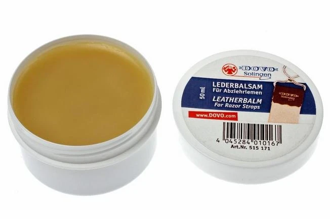 Dovo leather balm for leather razor strops.