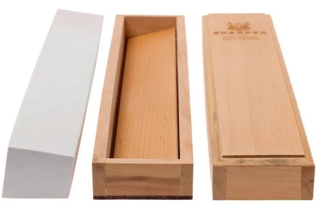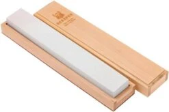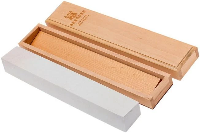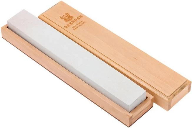 The Skerper Arkansas natural deburring stone is a stone for sharpening professionals and serious enthusiasts. This massive Hard Arkansas stone is comparable to an American 800-1000 grit synthetic stone. The stone gives the edge a bit more bite and a light polish.