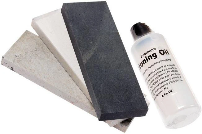 The Skerper Arkansas Deluxe Honing Kit is a complete sharpening set including 3 medium sized stones, honing oil, and a wooden storage box. The 3 stones come in varying grits: Soft Arkansas, Hard Arkansas and Hard Black Arkansas. The Soft Arkansas at 400-600 grit is the perfect stone to start the sharpening process where you need to set the initial bevel, and/or remove chips and rolls from the edge. The next stone is the Hard Arkansas at 800-1000 grit. This stone provides the initial polish to the blade and gives it a slightly polished, toothy edge. The Hard Black Arkansas at 2000-3000 grit is a polishing stone to further refine the edge from the previous stone.