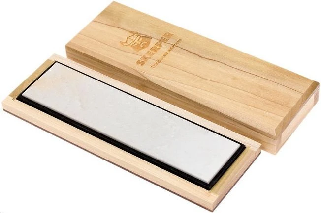 The Skerper Translucent Arkansas bench stone is the rarest of the Arkansas stones, producing the finest finish. Equal to a American 8000-10,000 grit stone, this will produce an edge that is highly refined. Perfect if you’re looking for the sharpest result possible. From straight razors to chefs knives, this stone will be a great finishing stone to any sharpening set. Long and wide enough for all sharpening applications, from kitchen knives, outdoor knives, various woodworking tools and razors. These stones come in 5 different grits, for a stone progression from rough all the way to a very finely polished edge. Each stone comes in its own wooden box for storage and transport.