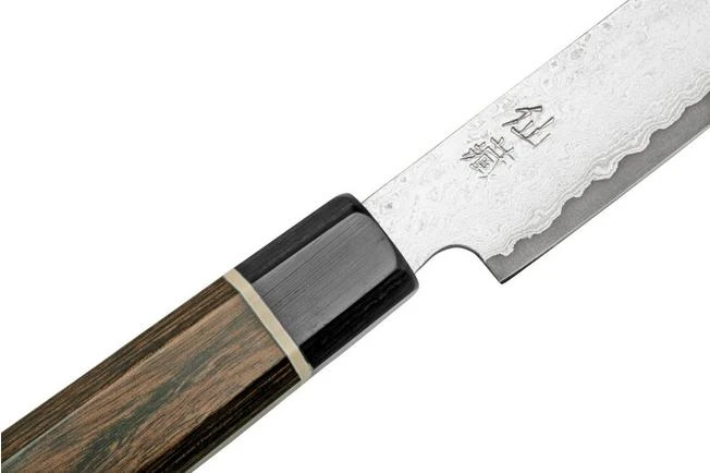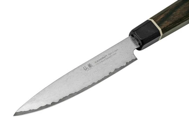 The Suncraft Senzo Black BD-02 utility knife 12 cm is a versatile kitchen knife. It is lightweight and perfect for small cutting tasks in the kitchen, like slicing pieces of tomato or cucumber.