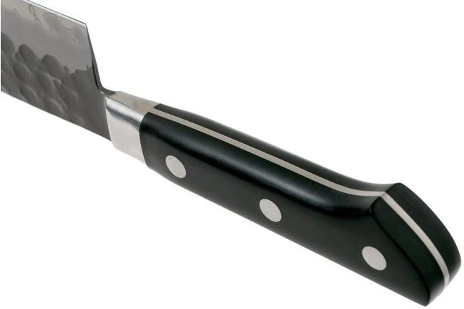 The Tojiro DP3 hammered nakiri 16.5 cm knife is a traditional Japanese vegetable knife and can be recognized by the angular and thin blade with rounded tip at the front of the edge. As such cutting perfect strips of veggies is a piece of cake! However, because of the thin blade you cannot use it to chop!