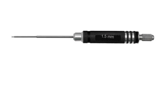 The TSPROF Hex Screwdriver 1.5 mm is a solid Allen key with a size of 1.5 mm. The handle is made from aluminium and has a diameter of 1.8 cm. You adjust the total length of the screwdrivers by loosening the screw in the handle, pushing the rod down and securing the screw again. The screwdriver is adjustable from a minimum length of 10 cm to a maximum length of 19.5 cm. This 1.5 mm Hex screwdriver is suited for all small components of the TSPROF K03 (for instance, for the sharpening stone holder) and almost all components of the TSPROF Blitz including the clamps.