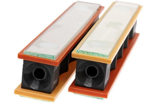 The Wicked Edge Glass Platens, set glass base holders are two base holders for the Wicked Edge Sharpening systems. The holders are comprised of a plastic base with two glass sheets. These glass sheets are meant as a base for the Wicked Edge Lapping Films to polish your knives.