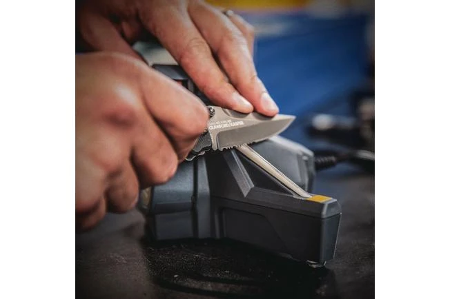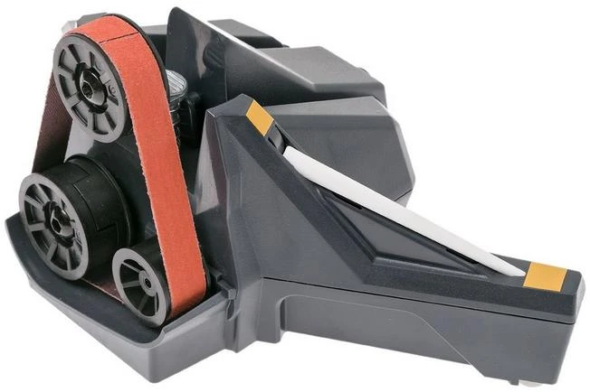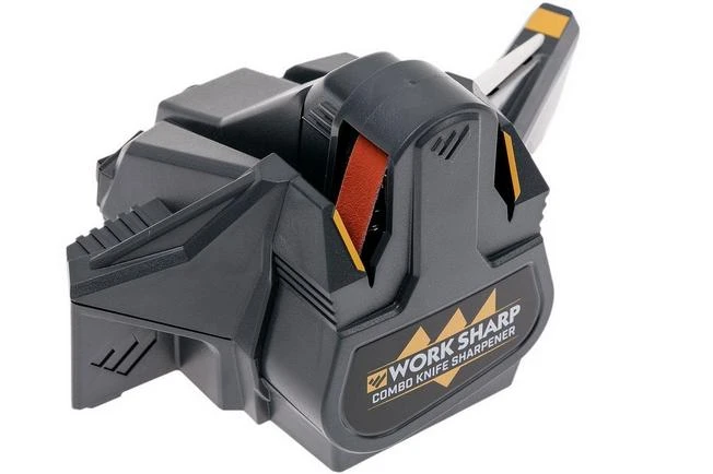 TheWork Sharp Combo Knife Sharpeneris a compact machine for sharpening and maintaining your knives’ edges. The Combo Knife Sharpener cleverly combines the well-known electrically-driven sharpening belt with a ceramic sharpening steel in one machine. For sharpening outdoor knives, kitchen knives, pocket knives and even knives with a serrated edge.