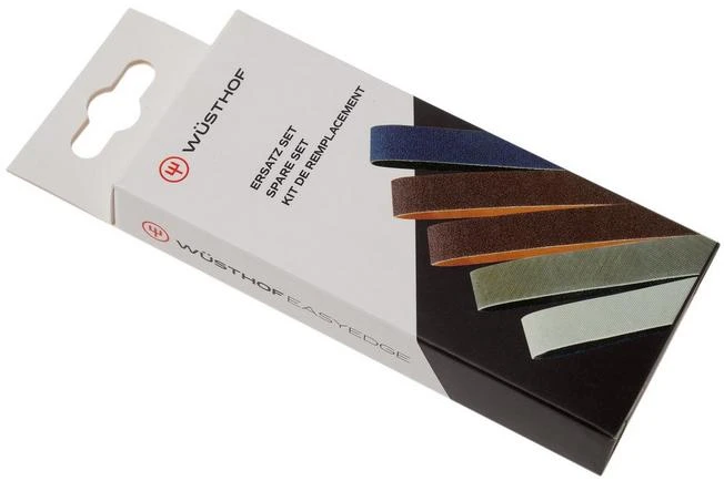 This Wüsthof Easy Edge replacement sharpening belt set contains five belt that can be used with the Wüsthof Easy Edge electric knife sharpener. These belts are also included with the knife sharpener itself, in addition to an extra-coarse sharpening belt to restore the edge of a damaged knife.