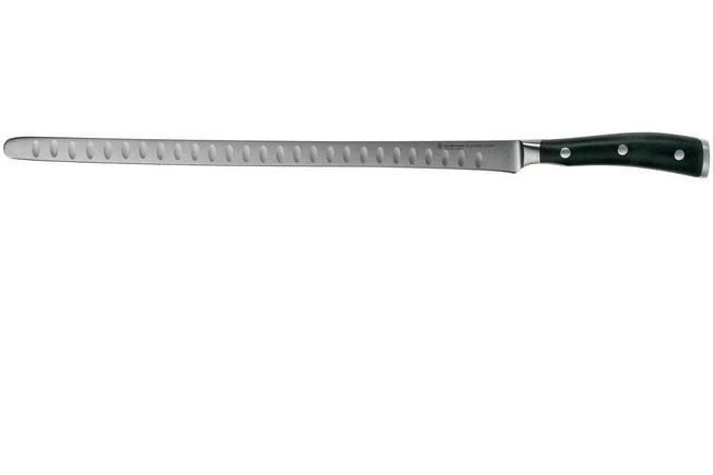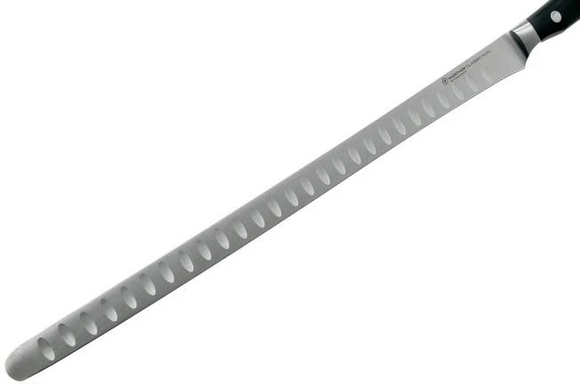 The Wüsthof Classic Ikon salmon knife 32 cm is truly the cream of the crop when it comes to top-quality salmon knives. The long blade ensures that you can cut thin slices of fish in one single movement. The low blade and the dimples ensure that the thin slices of salmon don’t tear because they stick to the blade.