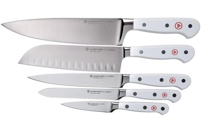 The Wüsthof Classic White 5-piece knife set with santoku is a versatile set you can use to prepare many different dishes. With the razor-sharp chef’s knife and the santoku with dimples you can effortlessly cut vegetables, meat and fish. The difference between these knives is the cutting technique. With the chef’s knife you use a rocking movement, and with the santoku (the Japanese version of the chef’s knife) you cut from back-top to down-front. During each movement the edge loses contact with the cutting board. One is not better than the other, it depends on your personal preference which one you will go with.