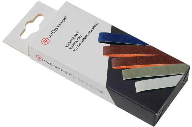 The Wüsthof Easy Edge replacement sharpening belt set contains all original sharpening belts that come with the Wüsthof Easy Edge electric sharpener, in addition to an extra-coarse sharpening belt to restore the edge of a damaged knife.