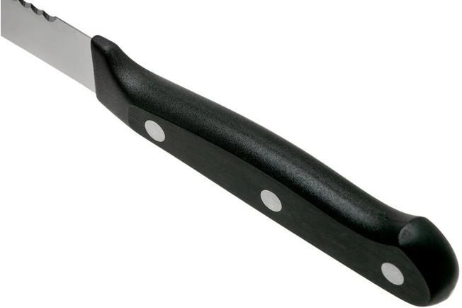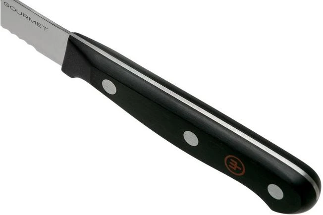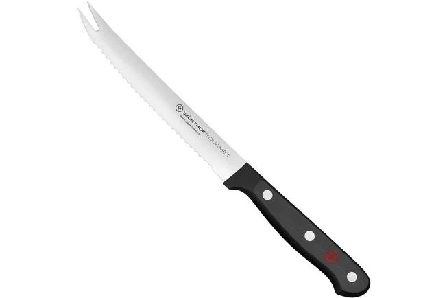 Cutting a tomato without crushing it is only possible with a real tomato knife. This Wüsthof Gourmet tomato knife 14 cm is enhanced with small serrations to make sure you can easily cut a tomato. You can, however, also use this knife to cut other types of vegetables. The front of the blade is enhanced with two pointed tips, to make sure you grab the cut slices.