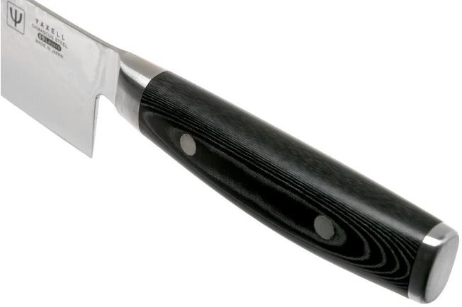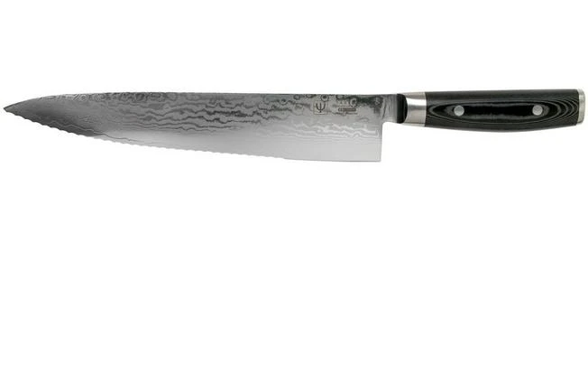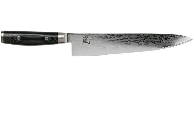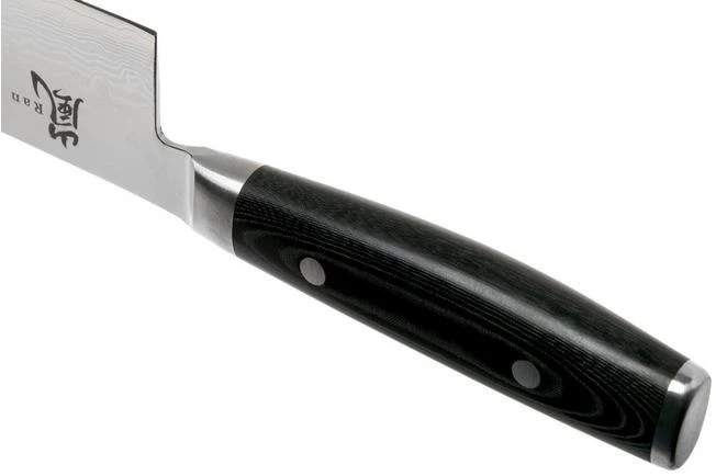 The Yaxell Ran serrated chef’s knife 25.5 cm is a remarkable Japanese kitchen knife with a stunning design. This chef’s knife is enhanced with a partially serrated edge. As such the knife is very versatile. The serrations enable you to use this chef’s knife to cut bread or the hard skin of large and solid vegetables. The shape of the blade, however, is the same as that of a standard chef’s knife. As such it is also as versatile as a standard chef’s knife!