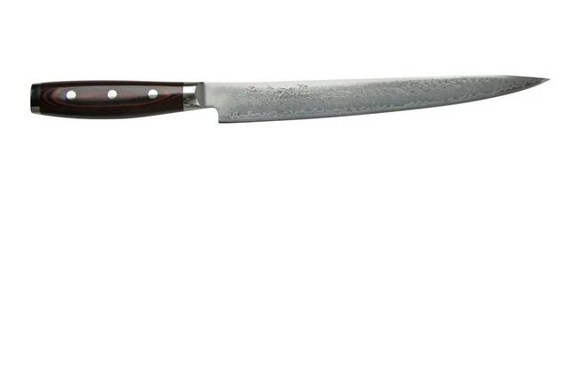 The Yaxell Super Gou Sujihiki is an elongated and razor-sharp knife for cutting sashimi and sushi. Its long blade allows you to cut wafer-thin, straight slices of meat and fish with one smooth movement.
