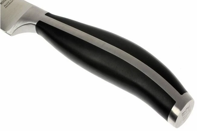The Twin Cuisine knives have, like many other kitchen knives, a full tang blade: the blade runs entirely through the handle. In this award-winning design, the blade runs horizontally through the black plastic handle. Which is therefore very beautifully interrupted. That handle is seamless and attached to the blade without rivets. The handle feels very comfortable. The bolster of the blade provides a good balance and protects your index finger, which logically falls behind the curve and therefore will not accidentally slip and hit the edge.